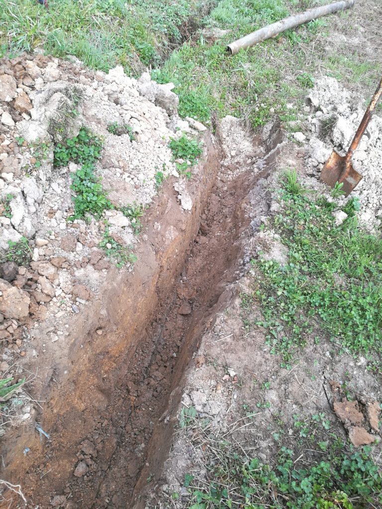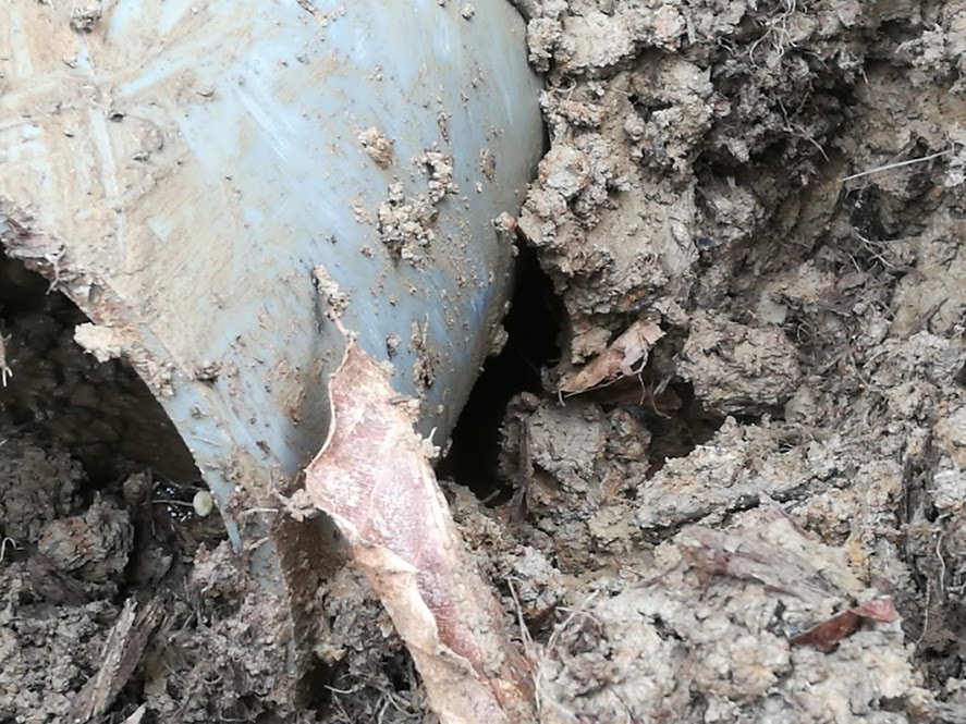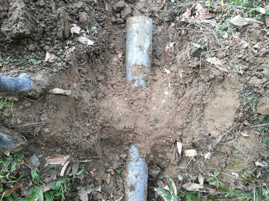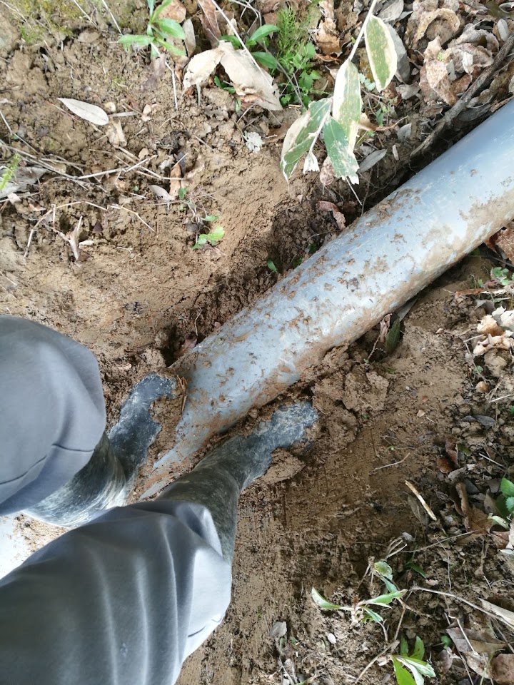 前から埋まっていたパイプを掘り起こし、この深さでは深すぎるのでちょっと埋め戻してパイプを入れます。