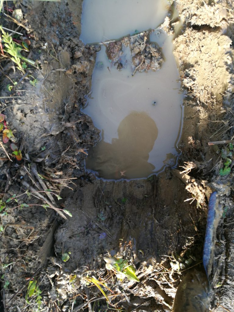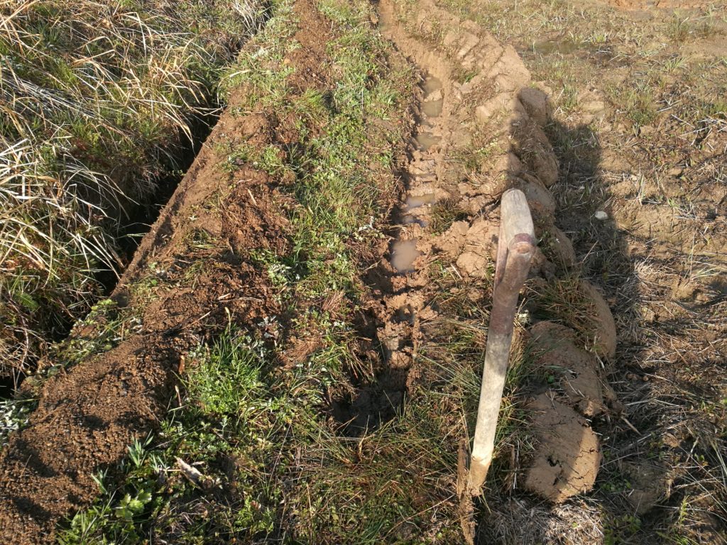もうすでに掘ってしまってるんですが上の写真右側に溝を掘り、染み出る水を排水する水路を手掘りします。