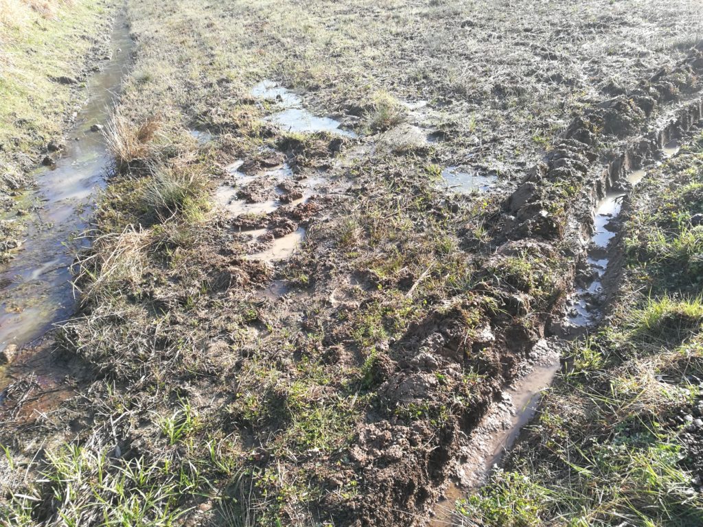写真左側はネキ溝と言って田んぼの水を抜くときに使う溝なんですが、溝の途中が高く、排水しきれてなくて水たまりになってます。こうなるとかなり下の方まで滲みて土が軟やわでこの続きとして田んぼの角も影響してます。